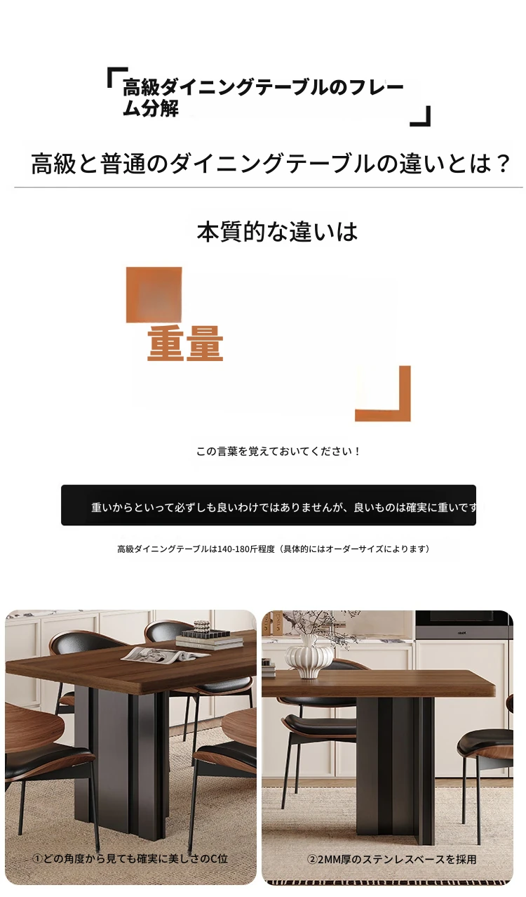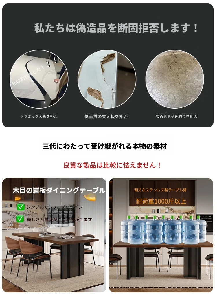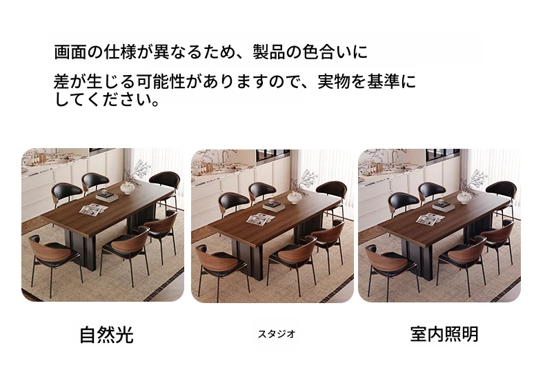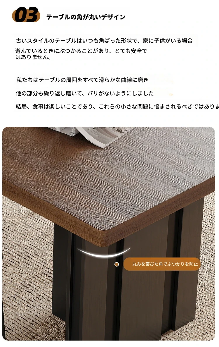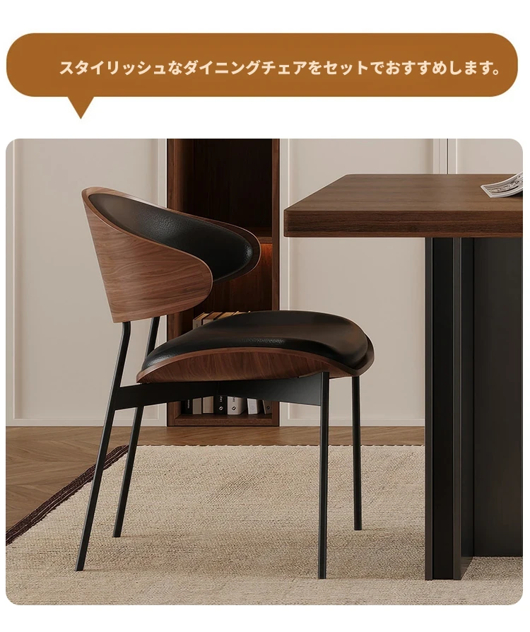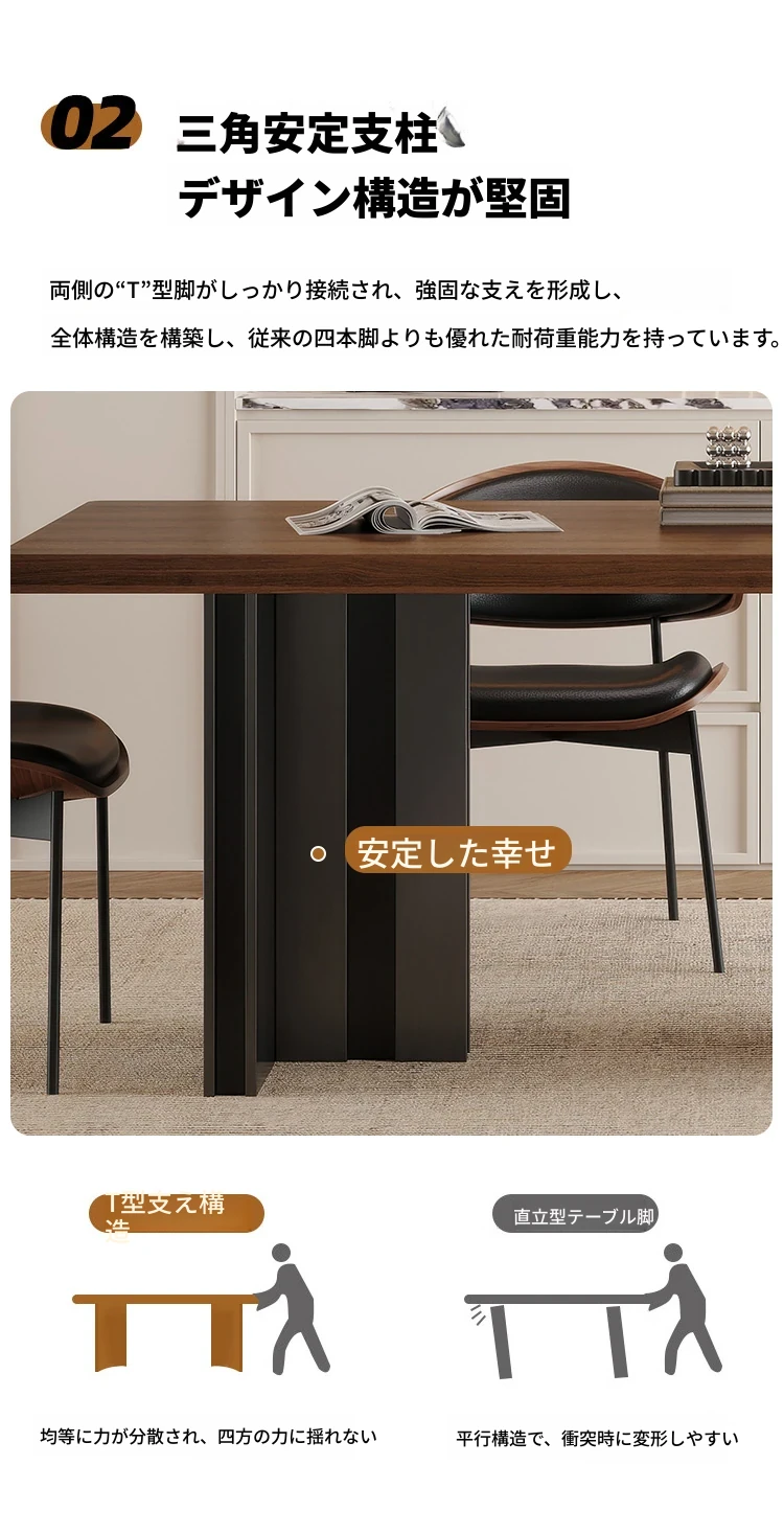 シンプルでモダンな侘寂スタイルのレトロな下掛けウォールナット色の厚手岩板ダイニングテーブルセット – 木目調の長方形デザインで、美しい食卓を演出!