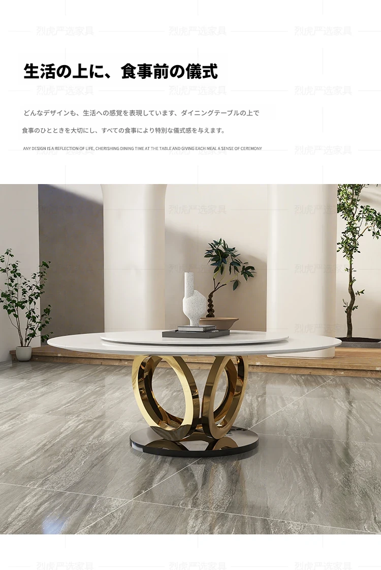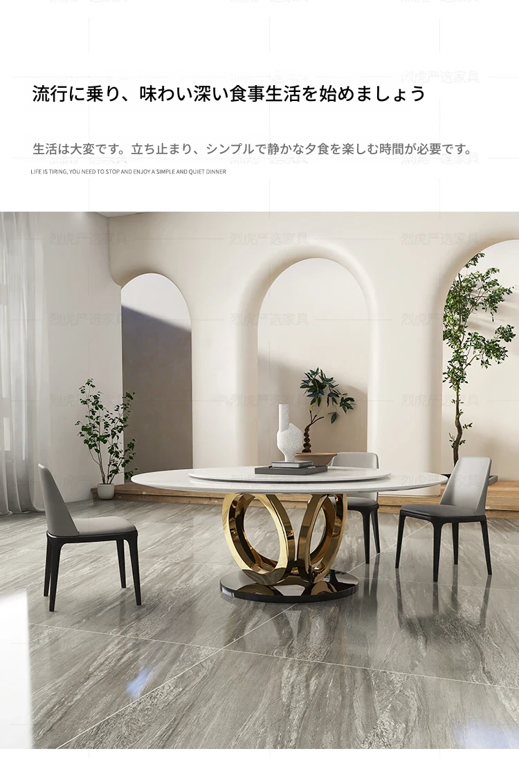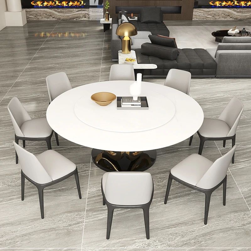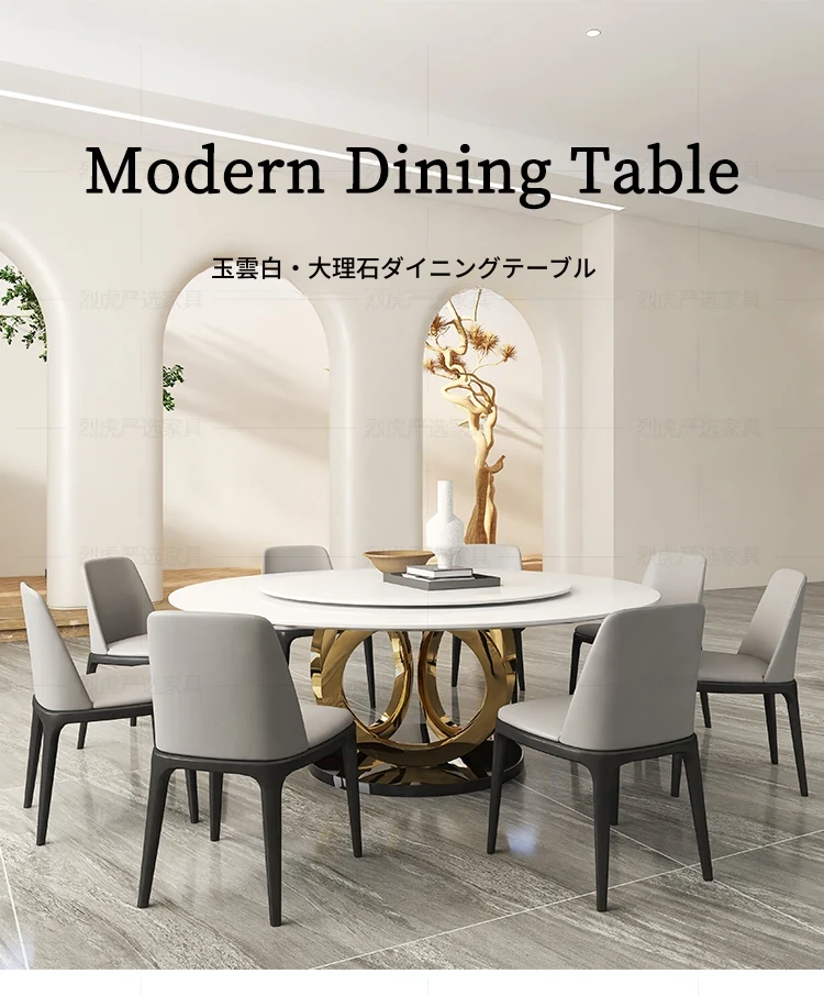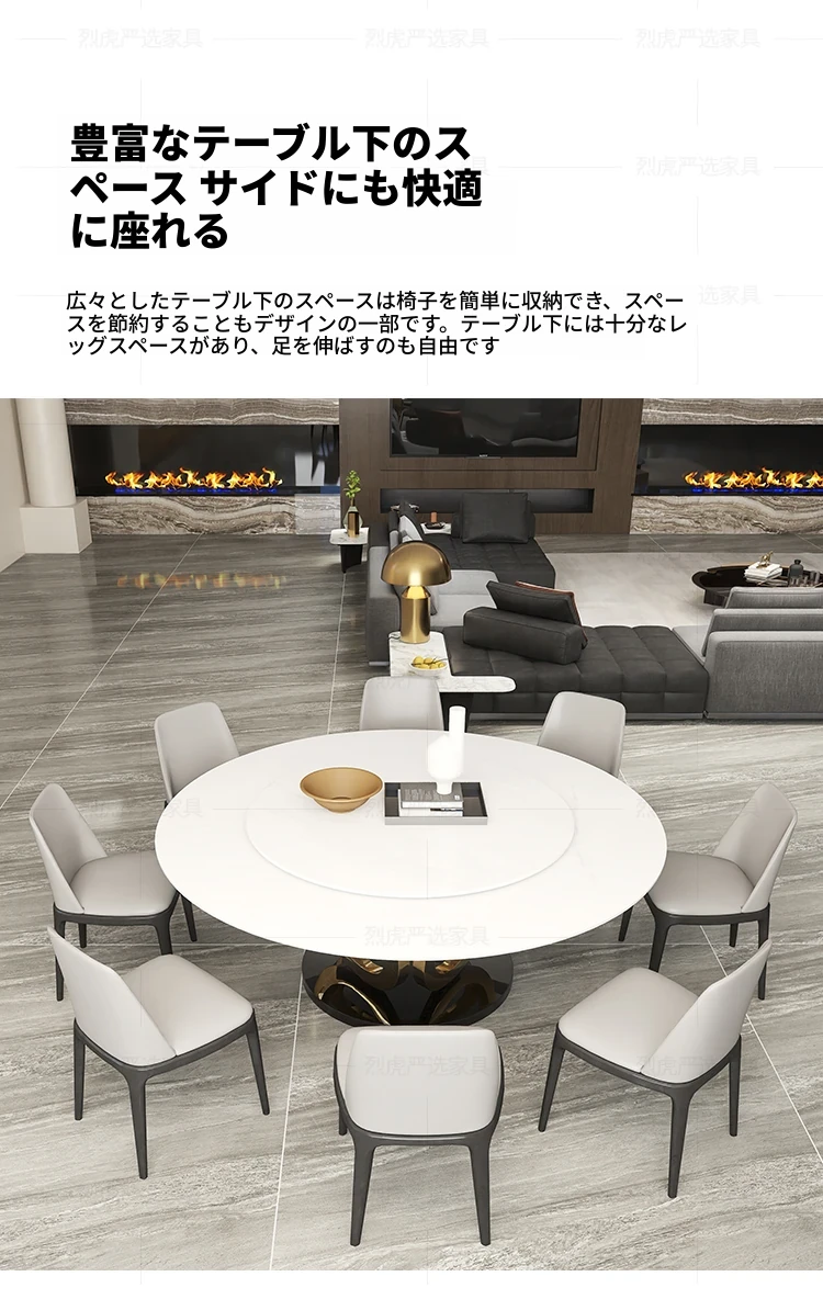 モダンデザインの大理石円形ダイニングテーブル - 回転式付きで便利!広々としたリビングにぴったりな大サイズ、椅子との組み合わせで家族団らんのひとときを演出します。電動機能付きで使いやすさ抜群!