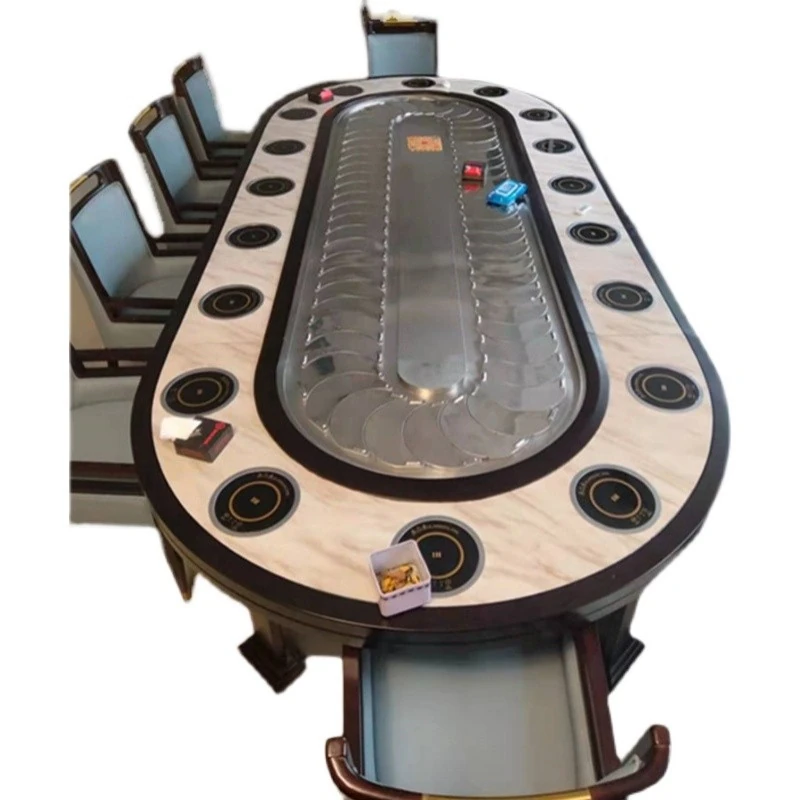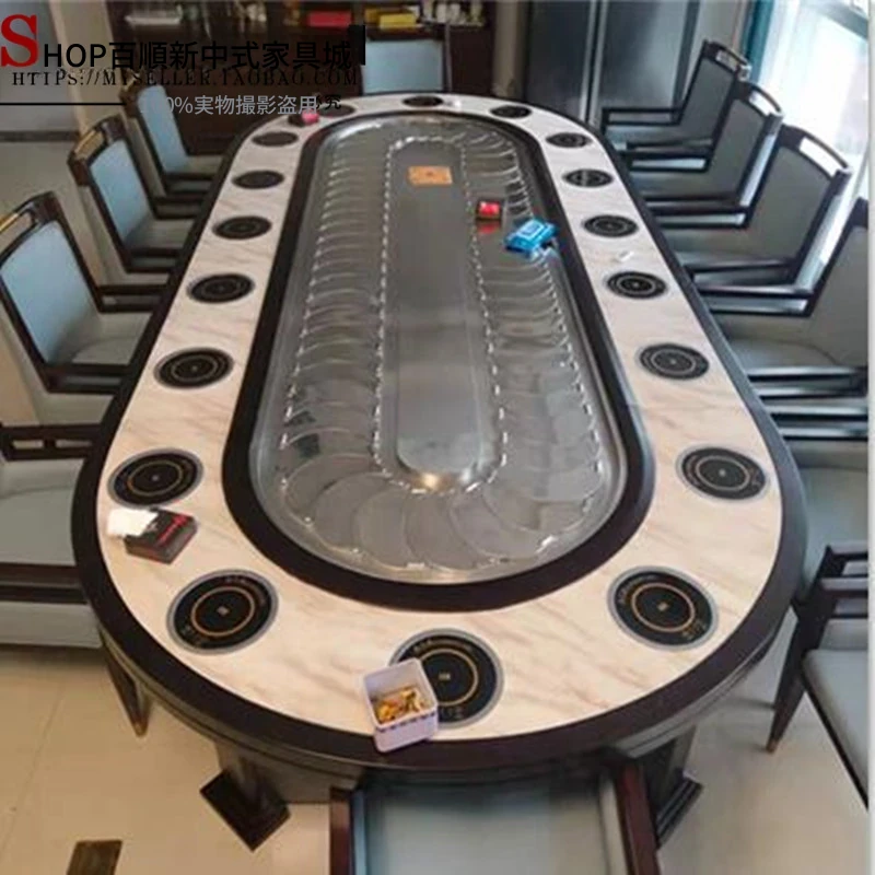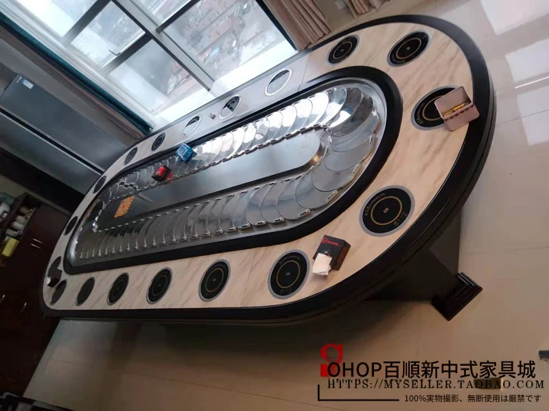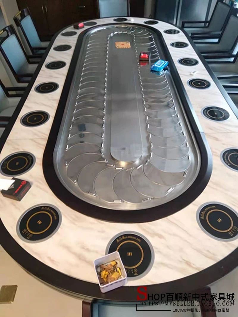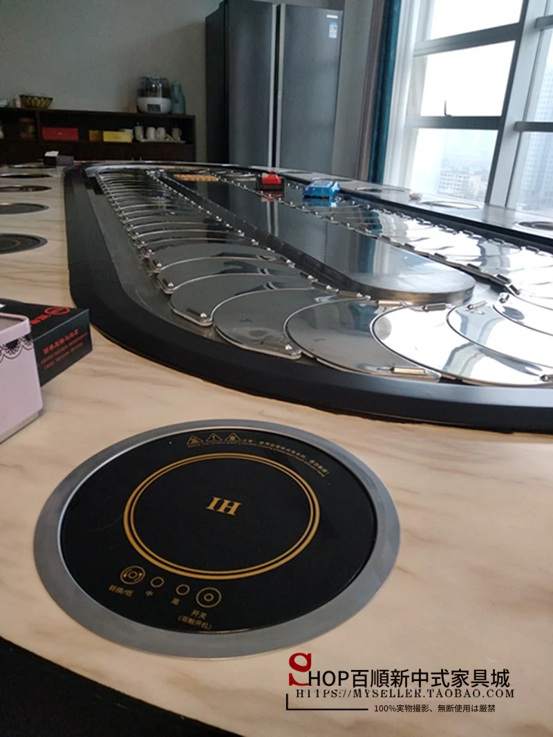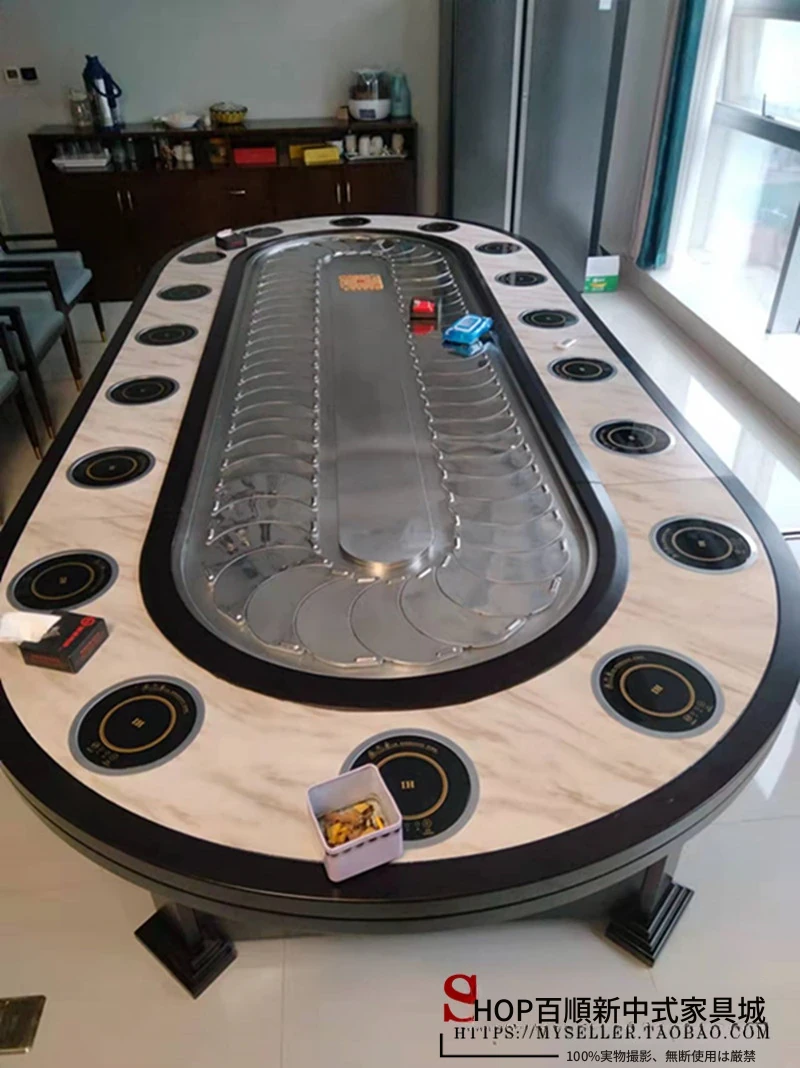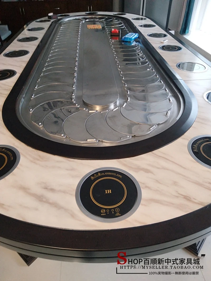 新中式デザインの電動レストラン用大きな楕円テーブル、長方形の宴会テーブル、回転式コンベヤー付きで20名収容可能!豪華な宴会に最適な一品。