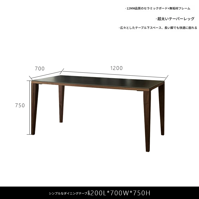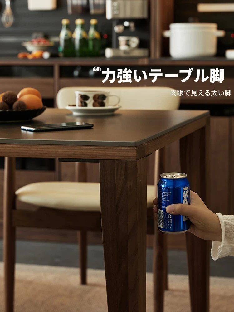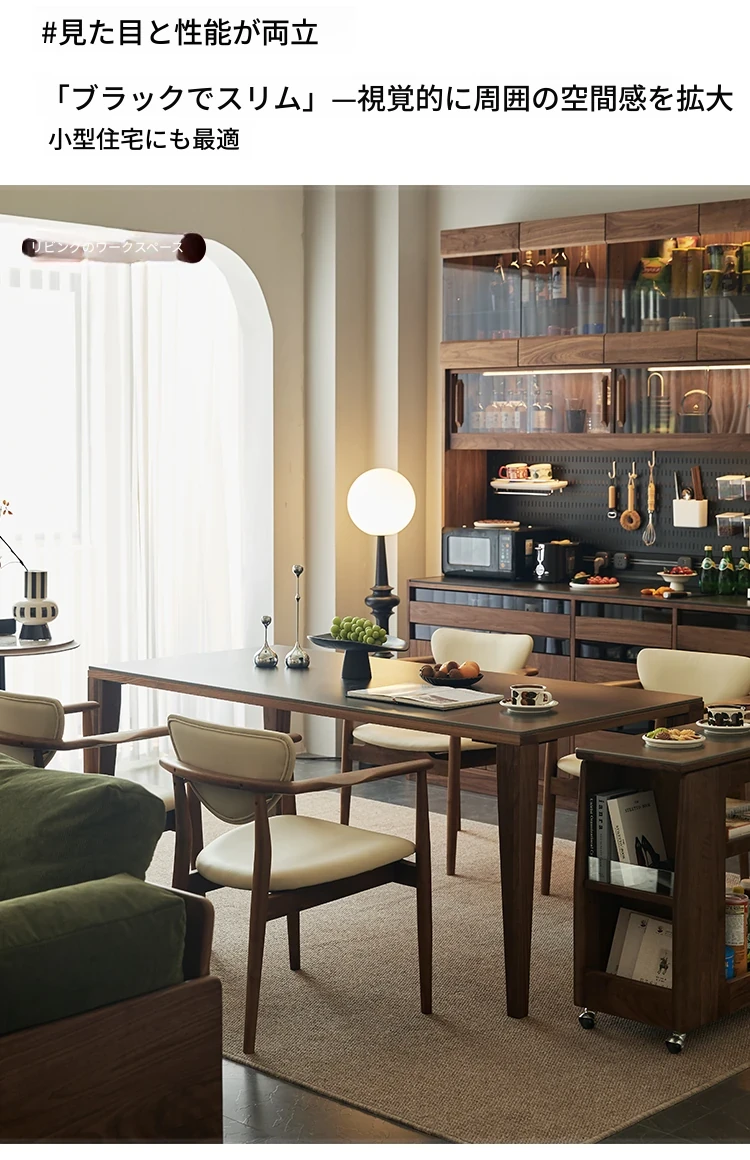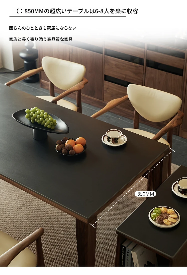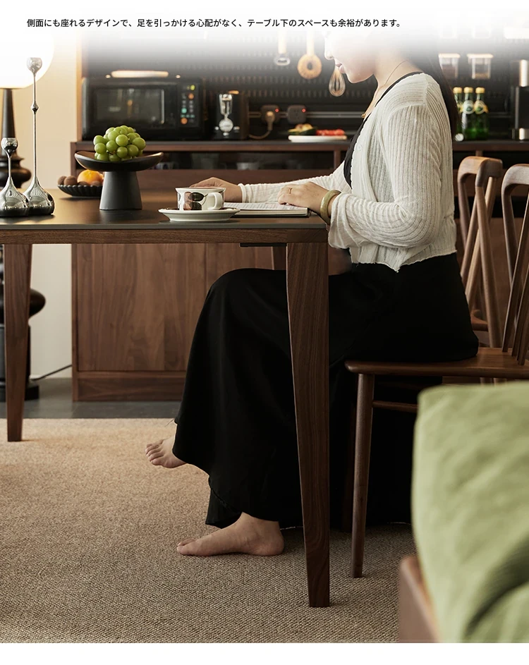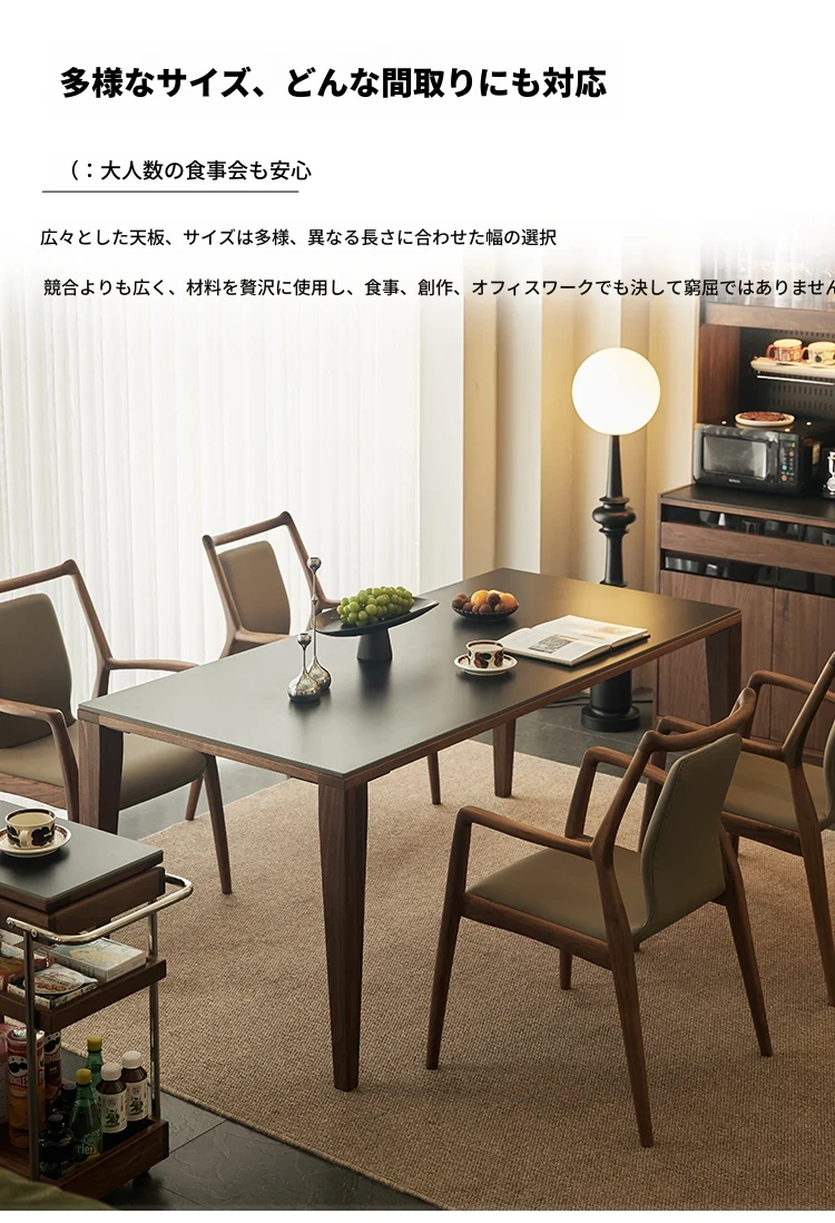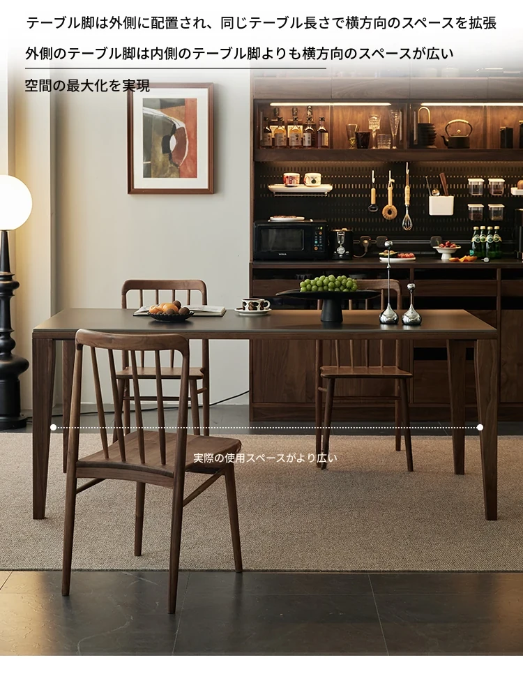 北米産ブラックウォールナットの無垢材を使用した北欧風モダンデザインの長方形ダイニングテーブル。小さなお部屋にもぴったり!シンプルで洗練されたスタイルで、食卓を華やかに彩ります。