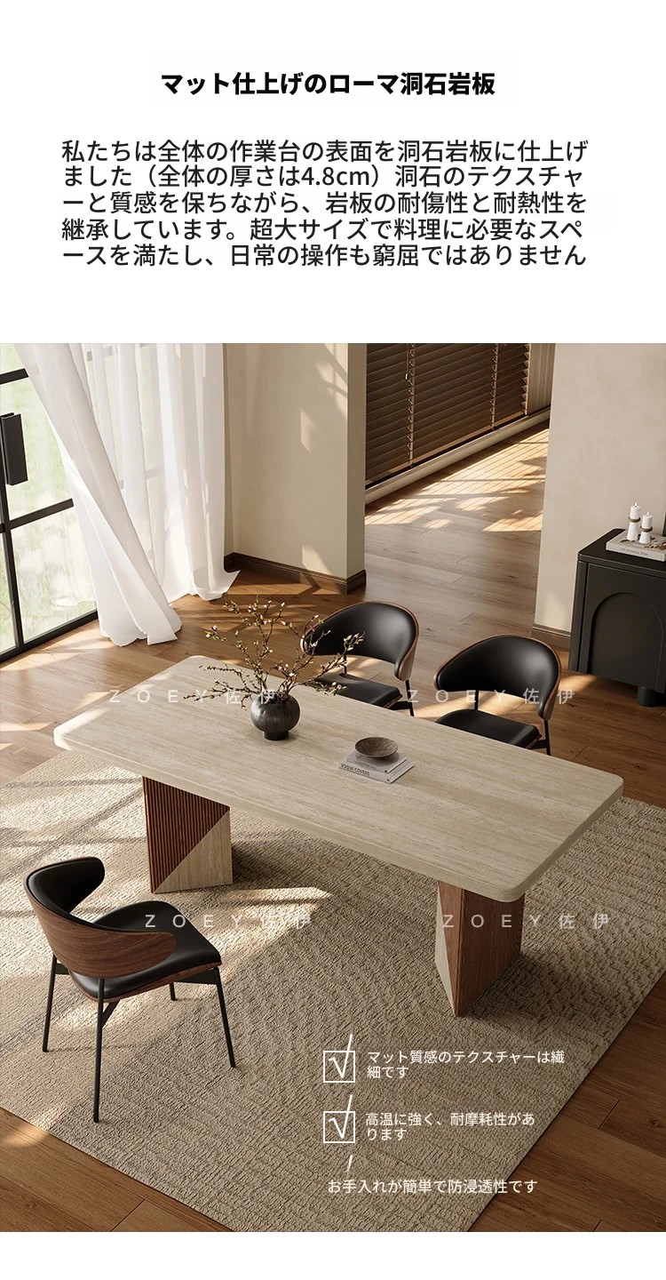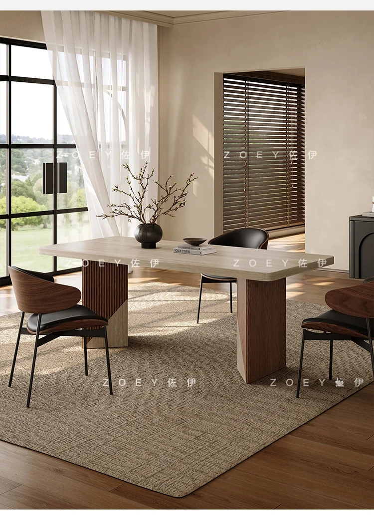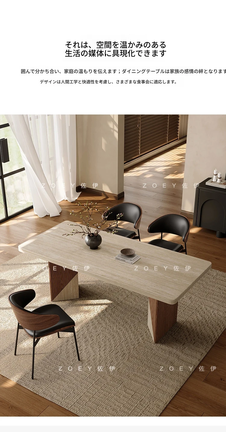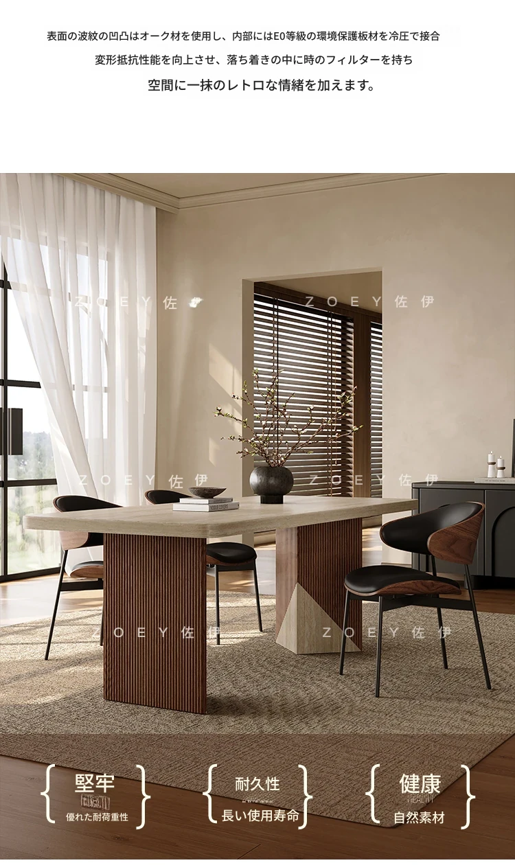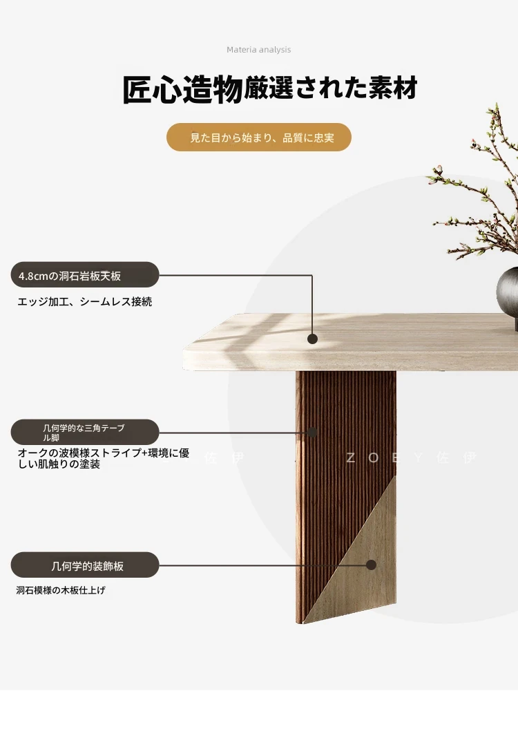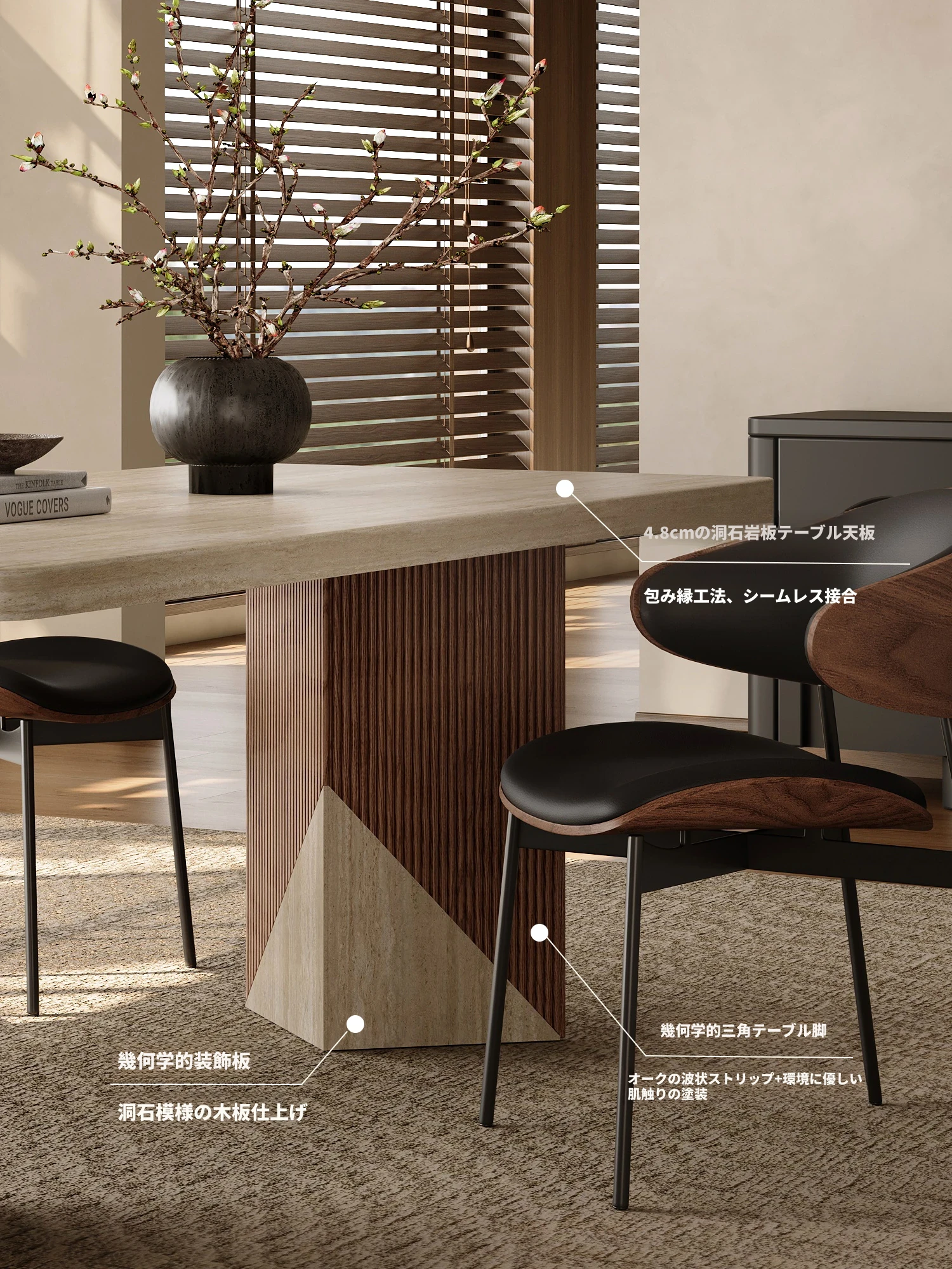 中古風洞石風デザインの高級感あふれる実木製ロングテーブル&チェアセット - 和の侘び寂びを感じるレトロスタイルダイニングテーブル