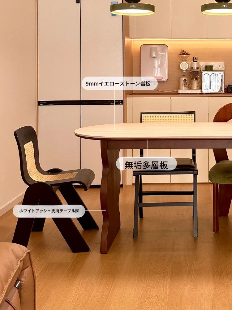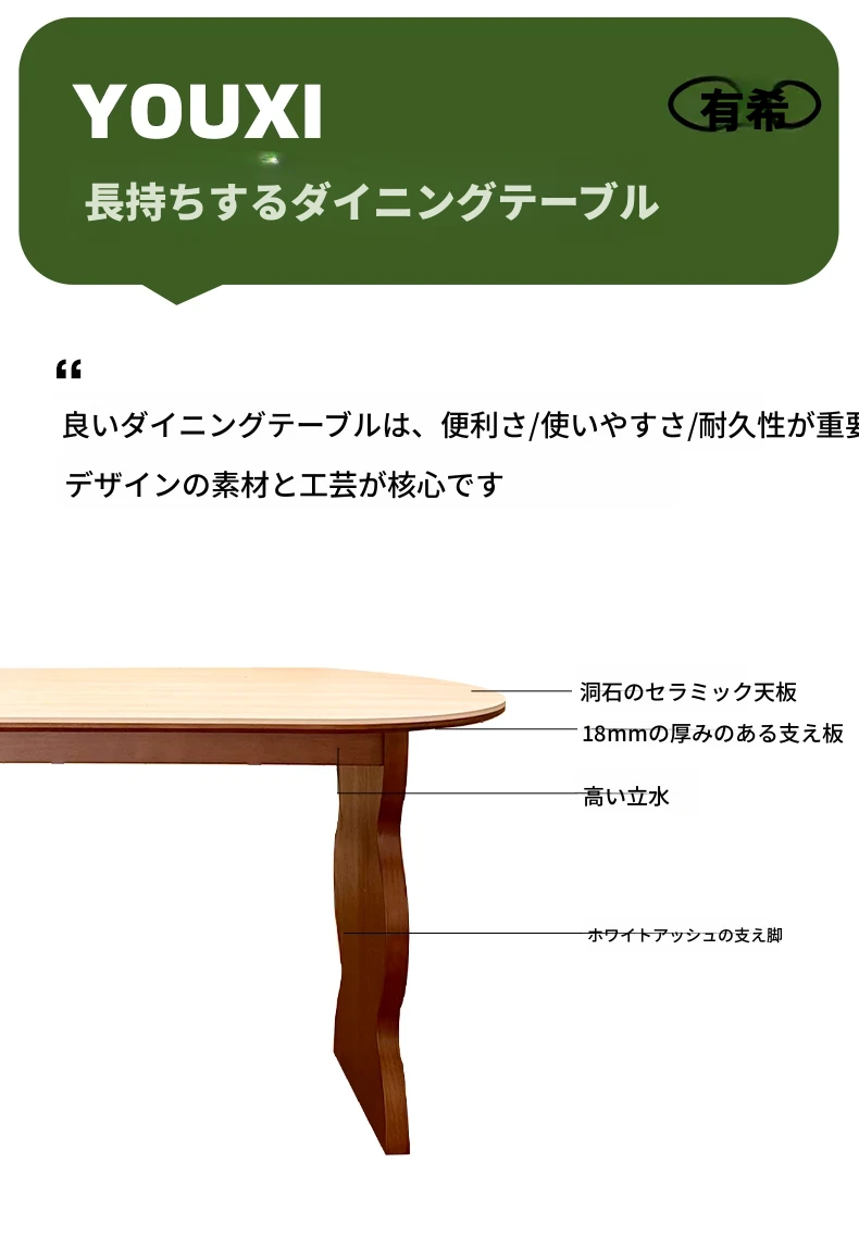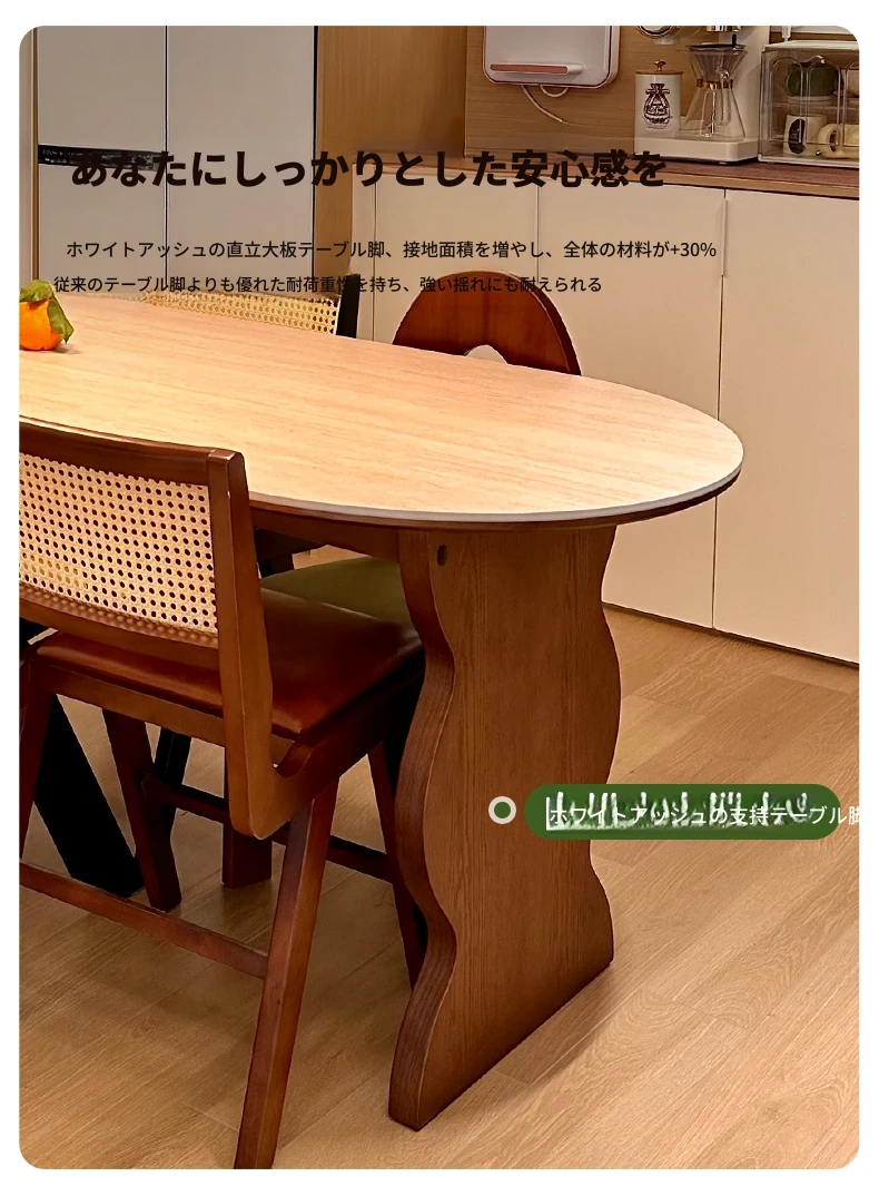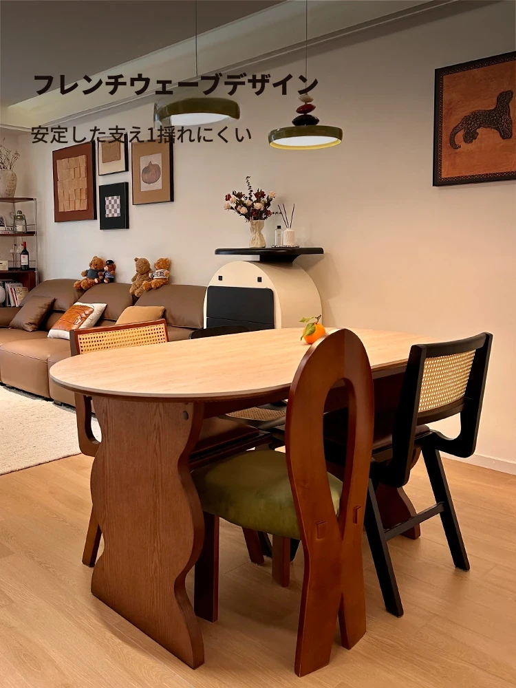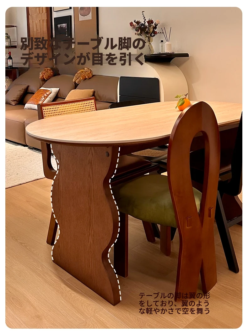 ユキ洞石の楕円形無垢材ダイニングテーブル - アンティーク風の波紋デザイン、快適な椅子付き、家族向けの長方形テーブル。おしゃれで温かみのある食卓を演出します!