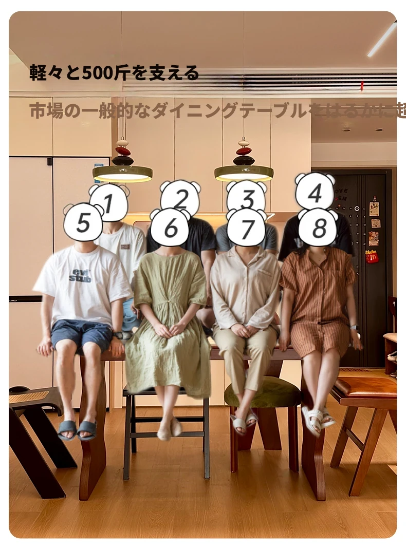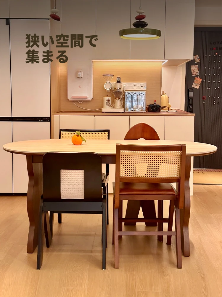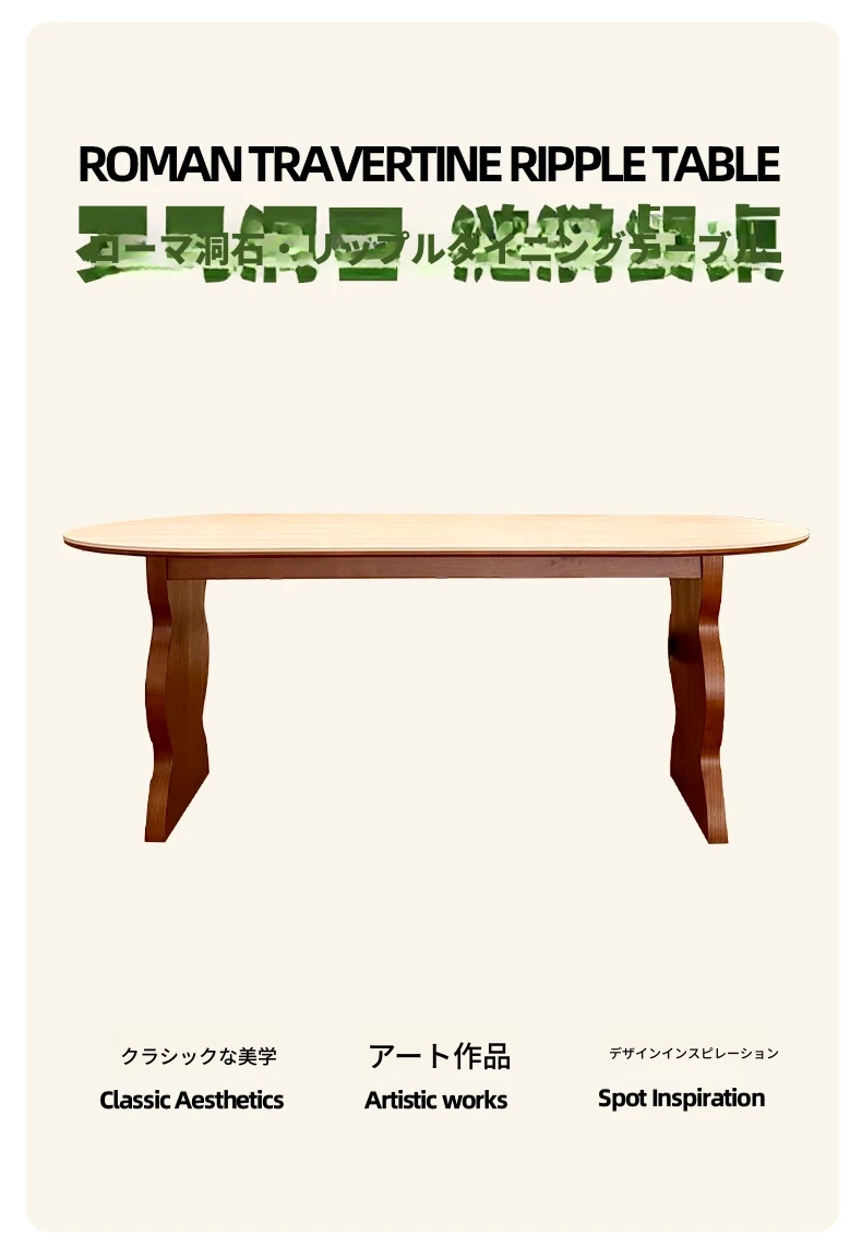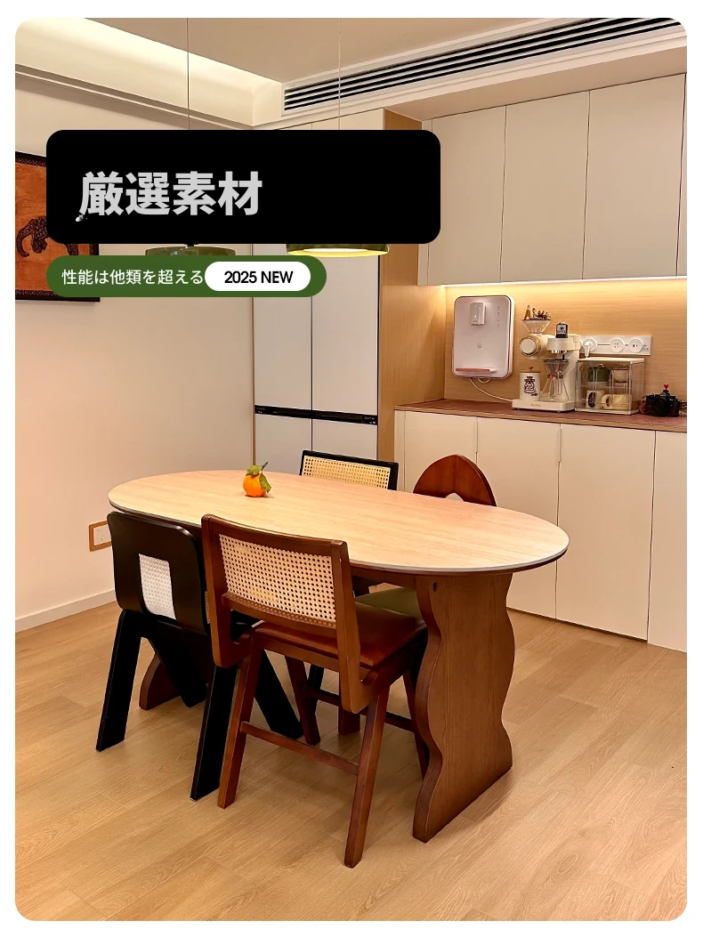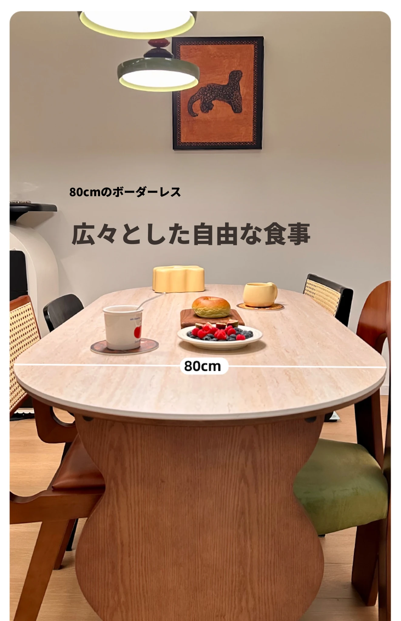 ユキ洞石の楕円形無垢材ダイニングテーブル - アンティーク風の波紋デザイン、快適な椅子付き、家族向けの長方形テーブル。おしゃれで温かみのある食卓を演出します!